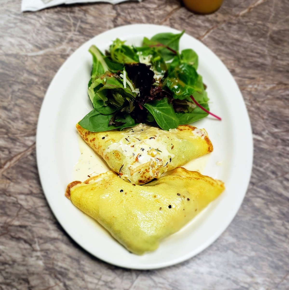 Delicious menu, I was only in town for 4 days and went there twice! I had the veggie frittata and the veggie crepes both excellent with great flavor. The service was efficient and friendly and I didn't feel awkward dining alone. You can eat inside or outside on their patio. (The name Turtle Cafe comes from the submarine that holds one person. They have it painted on the mural outside. You can see it and sit in it at the Connecticut River Museum.)